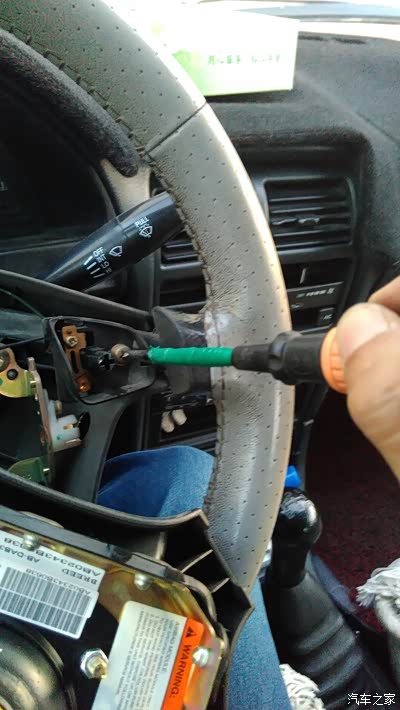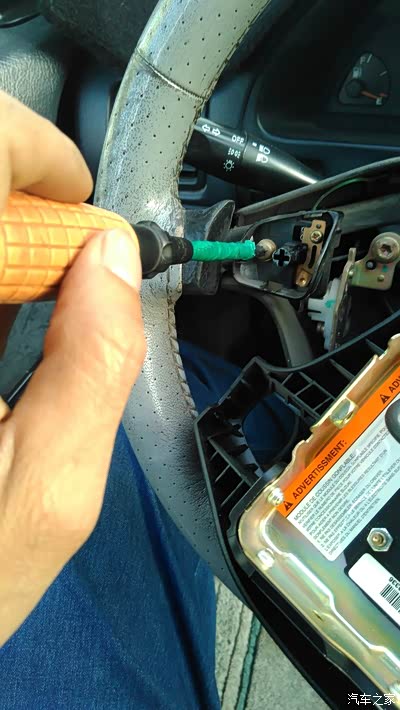 然后用小改锥撬喇叭按钮盖帽,小心慢慢撬盖帽外面有三个凸台。
