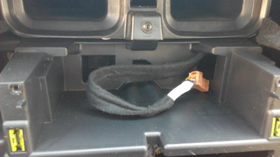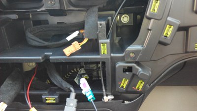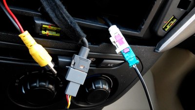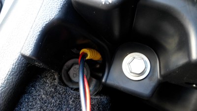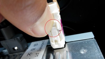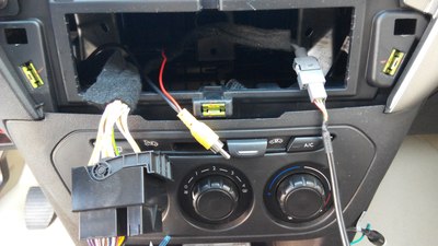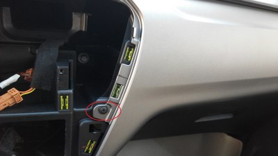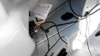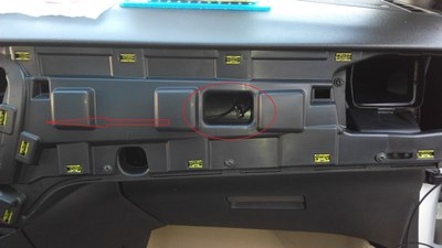 这个把拍照灯的小面板拆了,把摄像头的装上就可以了,完美匹配。(由于外面太冷,就没有拍过程)这个走线的孔,自己要用工具扩大一下,不然2个插头穿不过去,穿过去后,把走过来的视频线(注意:视频线的一个红色单线要加长1米左右,才能从下面拉回到上面接电,因为没有线,把以前用的诺基亚充电器的线先借来用了,里面是红白两根线,我并在一起接上了,所以下图会看到一根白线)和一个黑色的电源线从排风口穿下去,人从车底下把2个插头一一对插,再用胶带缠一下