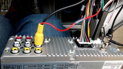 然后把视屏线上的一根红线和线束上的2跟棕色倒车信号线接起来,用绝缘胶带缠上