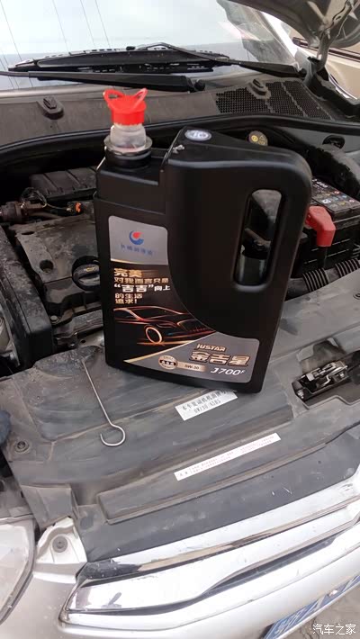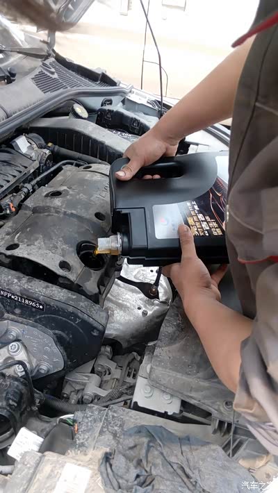 修车小弟在倒机油,颜色黄黄的,很像家里的食用油。机油是春节前在天猫年货节上买的长城黑色吉吉版全合成的,送了一个机滤。