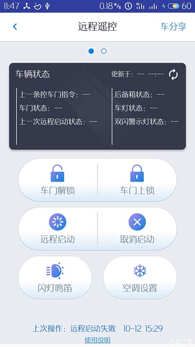 这个就是远程遥控的手机界面了,虽然反应速度慢了些,但平时还是很管用的!记得上回我家住五楼,我临出门前远程启动车子,然后放好手机,穿上外套,喝口水,检查一下有没有漏掉什么东西然后下楼,等到楼下,车子已经