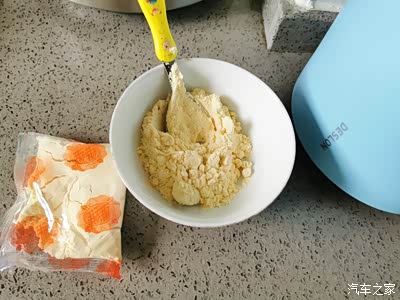 摊饼子的功夫拿出豆奶粉,水烧开了就泡。