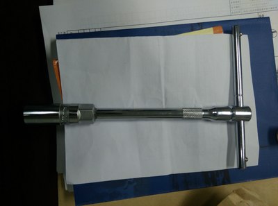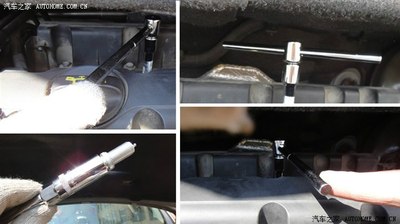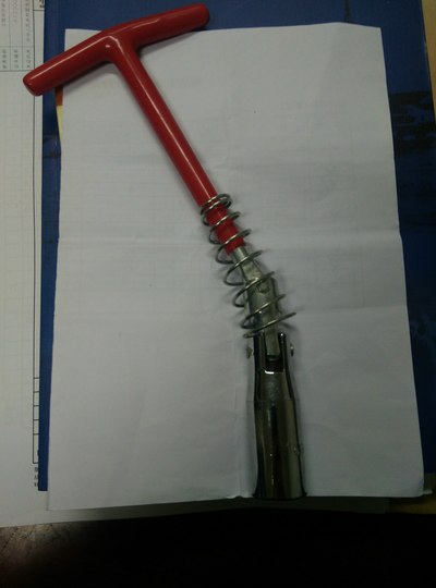 为了避免有杂物落入,所以拆一只装一只。将新火花塞插入套筒,用手摸索着就好位置,先用手拧,拧不动了再接上滑竿加力。可是当安装完毕时,问题来了:由于套筒里的橡胶套和火花塞卡得太紧了,拔出工具时总是只能把接杆拔出来而套筒则留在了火花塞上了。正在一筹莫展的时候,突然想到了第一次使用的套筒扳手,接杆和套筒是固定在一起的,这样用它来装不就结了