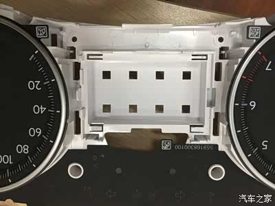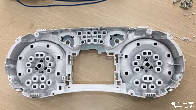 切割手术后的组合仪表中间部位白色壳休的背面。。全是洞洞。中间彩屏显示的位置掏空了。