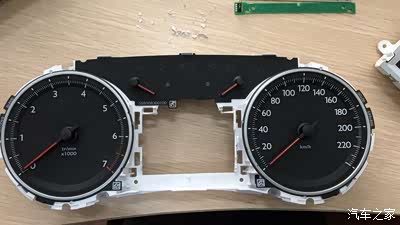 拆完组合仪表背面后转到前面。同样把前面黑色“外套”脱掉。前面的外壳是卡子的。。看一眼就知道是卡着哪些位置。一 一退掉就可以取下来前面的“外套”。