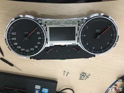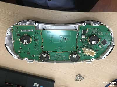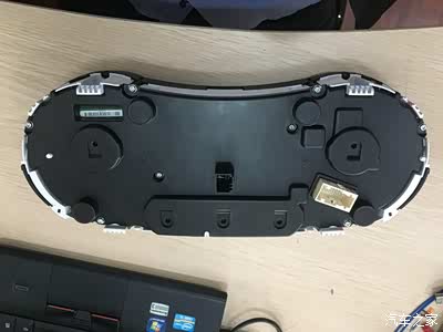 原车原厂的组合仪表背面脱掉“衣服”后的效果。黑色背壳总共8颗螺丝,仪表内还有两颗也需要拆掉。都是T9的螺丝。