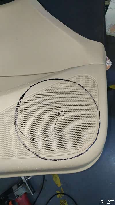 根据塑料门板背后的喇叭固定位置,确定前面开孔位置,用粗电钻打个孔,再用曲线锯开出圆孔。