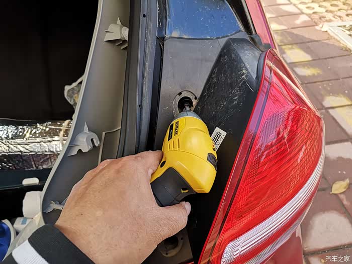 注意,拉开内饰板后下面会有个空洞,最好用毛巾塞上,不然工具和螺丝很容易掉进去,找出来不容易