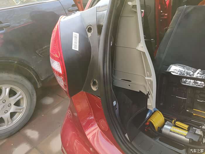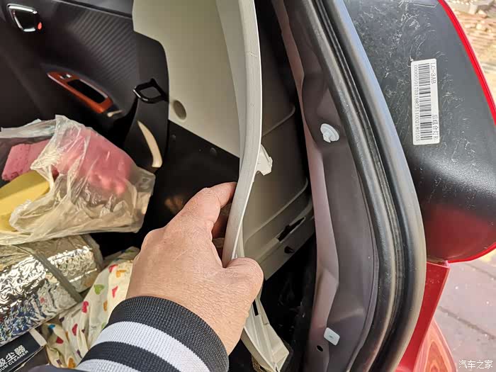 白色部分,那是相当不容易拆下来的。首先放放倒座位,然后拧下座位侧边和隐藏在黑色盖板下的两个螺丝。从后备箱口部这里,翻开黑色密封胶条,使点劲开缝看到卡扣后,用长的塑料撬棒辅助撬开。实在撬不到的,那就暴力拉断卡扣吧,我的这个部位两边的都断了,影响不大。再向上的两个卡扣,用撬棒辅助就比较容易拉开了。