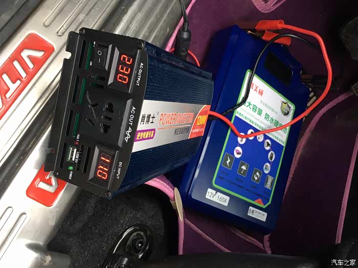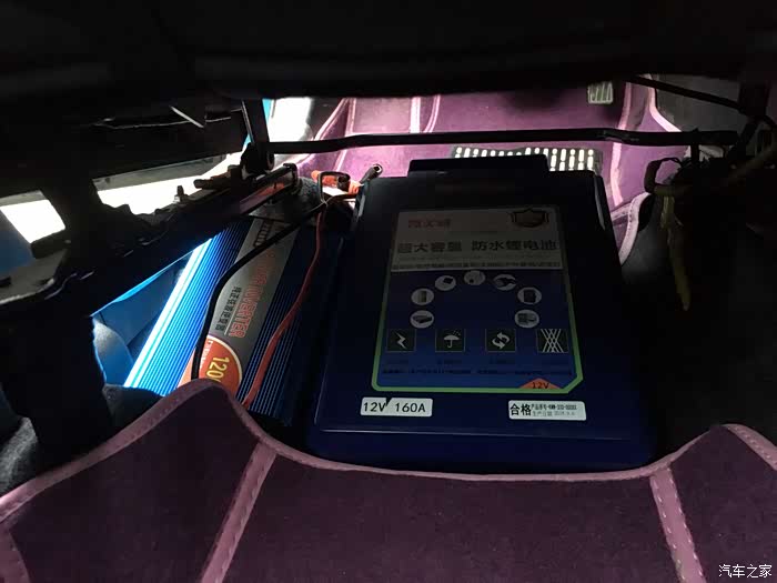 这是锂电池和逆变器正常放在车上的状态,位置是在主驾座椅下面,位置刚刚好,拿取插接观察使用也方便,赞。