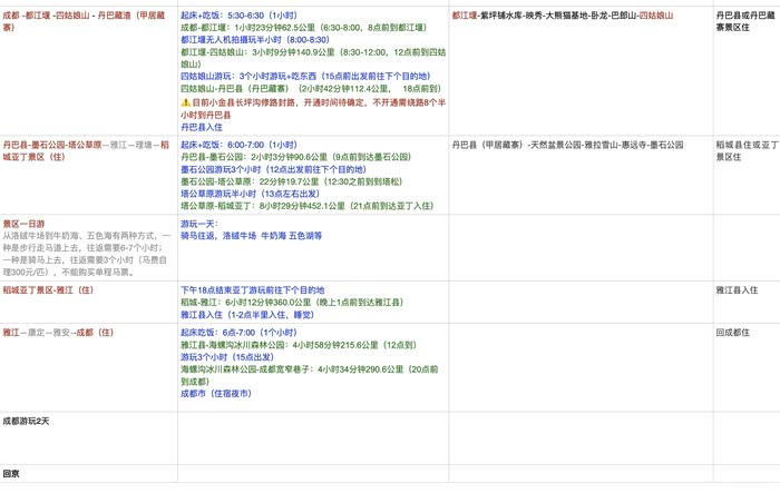 先附上我们去之前做的简单的路书,计划是好的,实际计划总是跟不上变化,因为自驾更多的是开车自由、停车自由,看到不错的风景就停下来放飞无人机,辅助AR眼镜体验不一样的景色,结果途中爬了一个不在计划内的雪山,导致我们去往稻城亚丁已经是下午景区关门的时间,一步错,就步步错了。