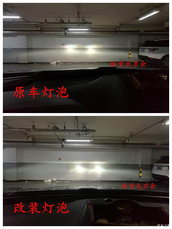 改装前后,在地库对着墙面的远光对比,改装后发白更亮些。