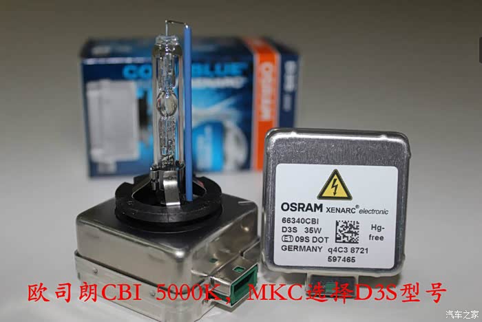 )MKC原车大灯是远近一体的,远近光只需要一只氙气灯泡,原车是欧司朗HBI灯泡,型号D3S,色温4300K。经过上网查询,和一些专业改装店交流后,可以无损替换升级的灯泡有两种,一是欧司朗CBI灯泡,色温5000K(这里需要补充说明一下,欧司朗CBI灯泡型号不同,色温也不同,D1S和D2S有5500K的,但D3S的只有5000K)。二是飞利浦极劲光XV灯泡,色温是4800K。其他品牌和国产灯泡就不再推荐了。这两种只要保证正品,就绝对靠谱。