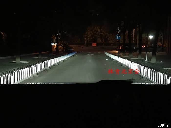 改装后,无路灯小路近光效果,看车前很亮,两侧护栏清晰如昼,感觉非常不错。