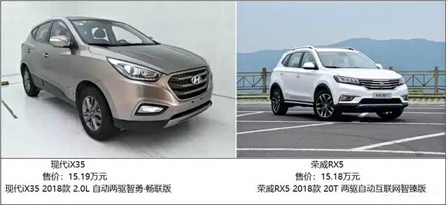 今天就为大家带来比较不错的两款紧凑型SUV,他们分别是:上汽集团——荣威RX5 2018款 20T 两驱自动互联网智臻版和北京现代iX35 2018款 2.0L 自动两驱智勇·畅联版