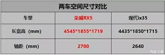 空间上荣威RX5在车身和轴距都要比现代ix35长上不少。再加上荣威RX5后排座椅可以放到,所以在空间上要比现代ix35大。
