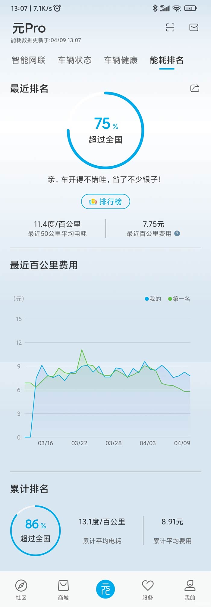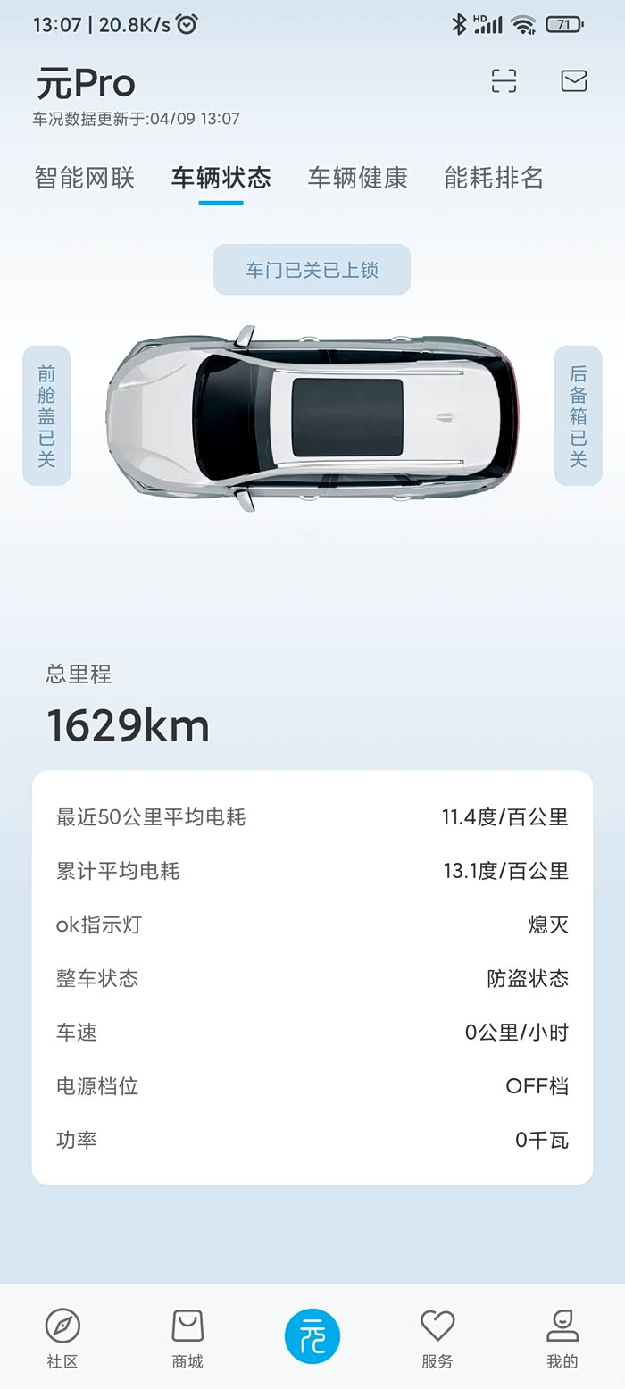 电耗:主要用于国道70-80速度和上山下山的路,目前未开空调显示累计平均电耗13.1,满电的时候掉电慢,要没电的时候掉的快一些,没有记过充满能跑多少,估计差不多能到标称里程。