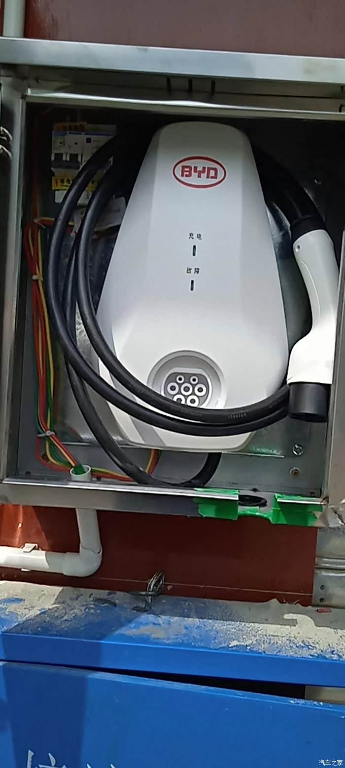 同时和安装充电桩的师傅联系,开始师傅估计说充电桩坏了,准备给我重新发一个。下午师傅又打电话说充电桩里面还有个空气开关,让我看看是否跳闸了。确实跳闸了,合闸没有显示故障,估计没问题,只有等车修好再试了。