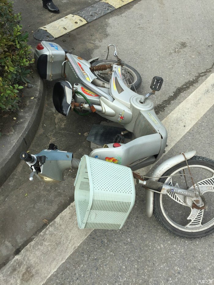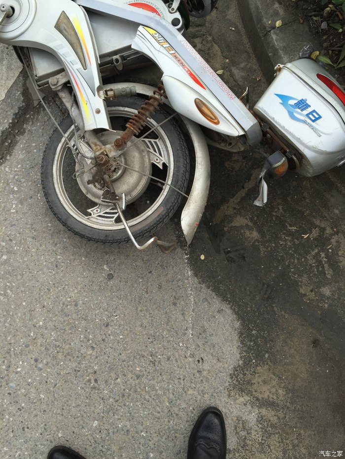 白色的痕迹能看出来 电瓶车撞离了原来的位置 请忽略我的鞋子