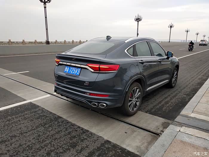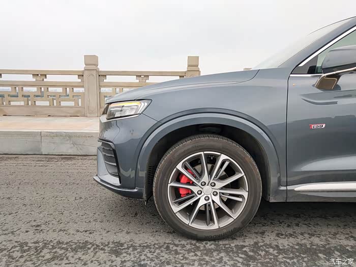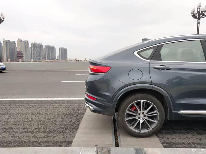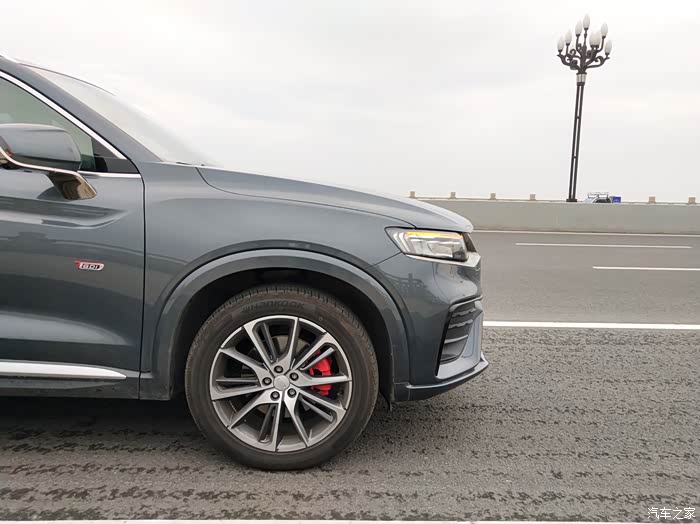 星越采用了轿跑式的造型,整车的运动感极强。为了营造这种运动感,星越在细节处非常用心,像熏黑的中网、黑色车标、溜背式造型、上扬的腰线、运动轮胎、红色卡钳、四出排气等细节都是其运动属性的体现