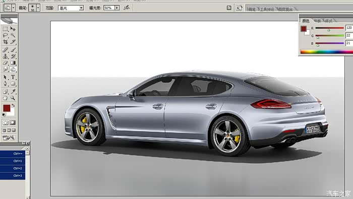 第五,现在开始用PS的钢笔和毛笔工具丰富阴影细节,这块比较难,因为没有实车对照,只能自己YY细节。如有较假的地方,请坛友们多多包涵。此外,全新panamera的门把手、后保险杠、车窗造型、散热口全变了,所以得一个个画。因为后保险杠太难画出来,所以暂时用现款的panamera来修改,估计新款的也不会相差很大。