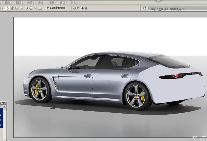 好了,有了这些细节,就开始做效果图了。但车轮哥并不是画匠,所以靠几个小时来画一部逼真的车,目前还做不到,所以只能找现成的修改。考虑到新款Panamera和现款有很多相似之处,所以先贴入一张现款Panamera。