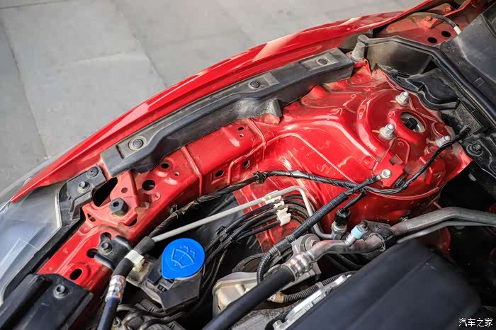 这个翼子板背面的加强件真的很粗壮!和水箱框架连成整体,没有像别的车子断开。