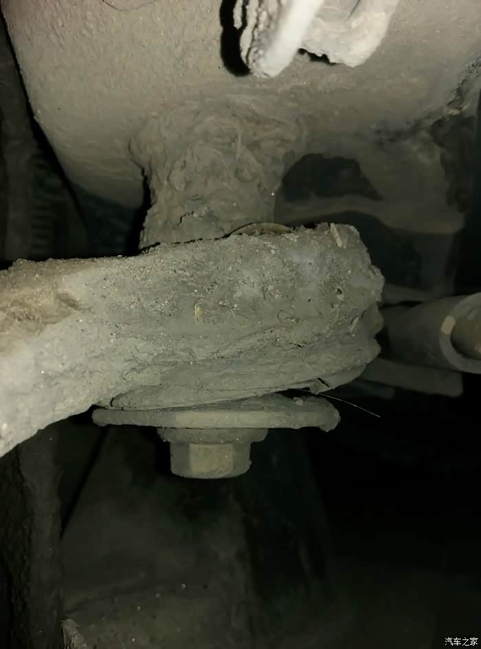 左后内侧,橡胶衬套虽然没掉,但目测摆臂和垫片的位置和损坏的那边极为相识,估计也撑不久了。