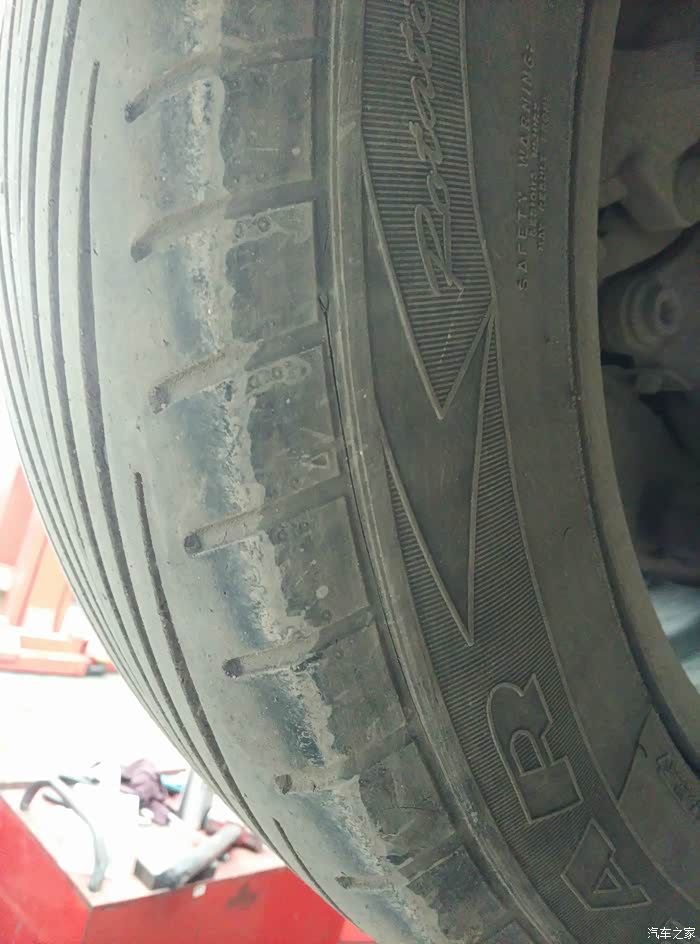顺便检查了下轮胎,右前轮内侧有条细口,很浅,像是被划伤了,。对了,顺便提醒下大家,我的右前轮内的ABS线和刹车油管有点干涉,把ABS线支架掰了下,让它和刹车油管分离了,左边的也检查处理了下。建议大家检查下,刹车油管磨破了可不是好事。