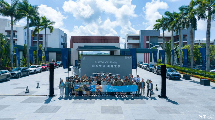 先发一张我们的大合影!蓝天、白云、椰树下,我们在#山系生活 漫游之旅#的主题板前合影,大家笑的都很开心~~两边是各种颜色的马自达CX-50行也,场面甚是宏大!!!
