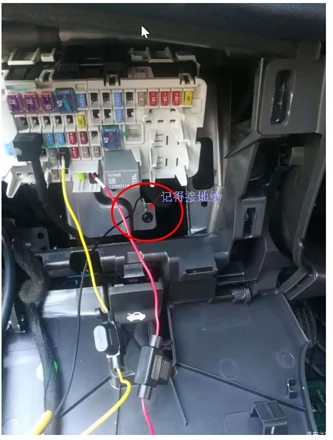 打开左侧下方的保险盒,记录仪总共3条线,黄色线B+接常电,红色线接ACC线,黑色搭铁,君威车内小保险丝有分2种大小,记录仪带的保险丝插头是大的,也就剩下2个位置,刚好一个常电,一个ACC,可以用12V电笔测一下。