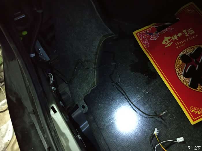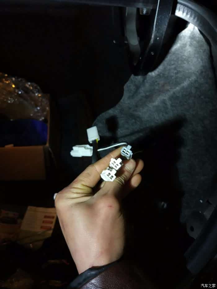 打开后备箱,看到右边上面两个塑料扣,用一字螺丝刀一翘就拿下来了。可以看到右后尾灯有两个原插头,把它们拔下来如下图。