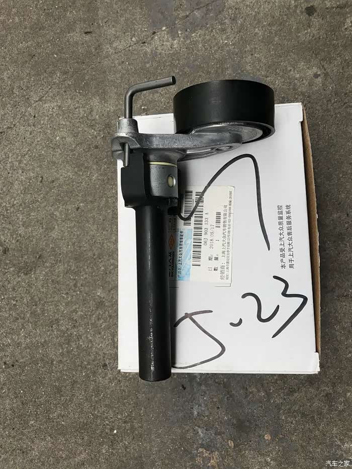 原厂发电机皮带涨紧器。TX们在更换正时链条时,切记检查下涨紧器,最好一起换了。涨紧器的头部正对着车架右侧大梁。更换此件,要把发动机往下沉。才能抽出涨紧器。工作量也大。