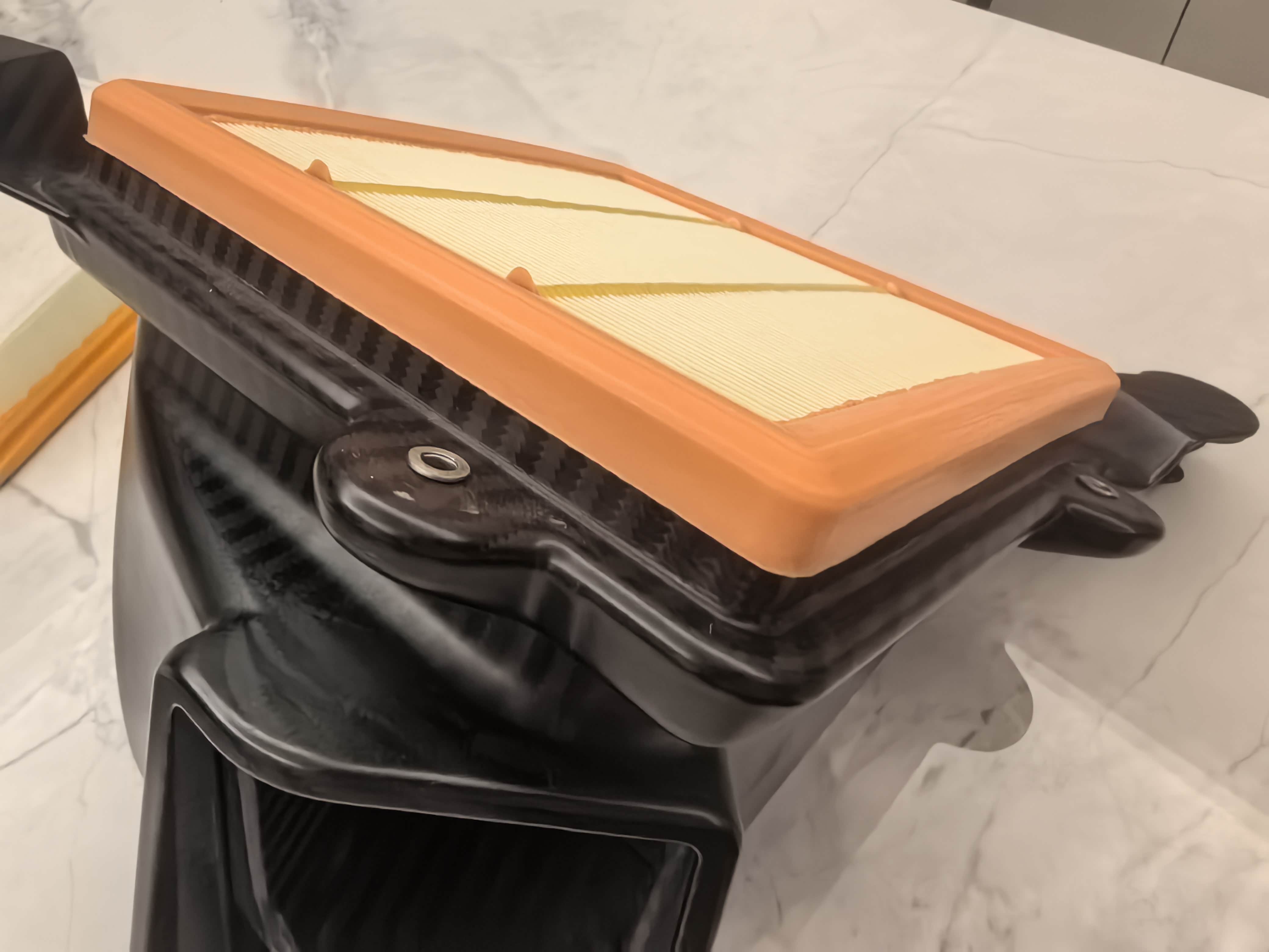 另外碳纤维风箱还有个优点就是隔热,而进气温度和油耗还有动力都有关系。进气温度过高会提高油耗和降低动力输出。其实日常开差别不大,但连续驾驶超过一个小时应该就会体现出来区别,毕竟发动机舱内的温度是很高的。