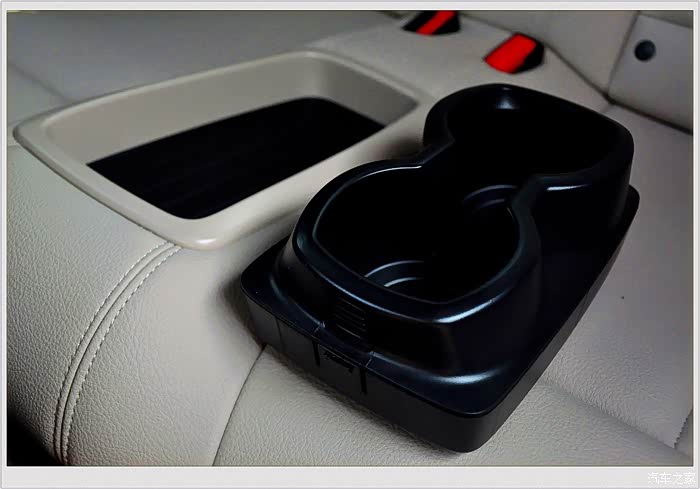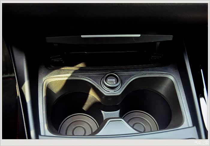 中控杯槽,要吐槽的是,杯槽前面那个很鸡肋的储物格,手机放不下,连停车卡也不能完全放下去,所以平时手机和停车卡其实都是插在杯槽里的