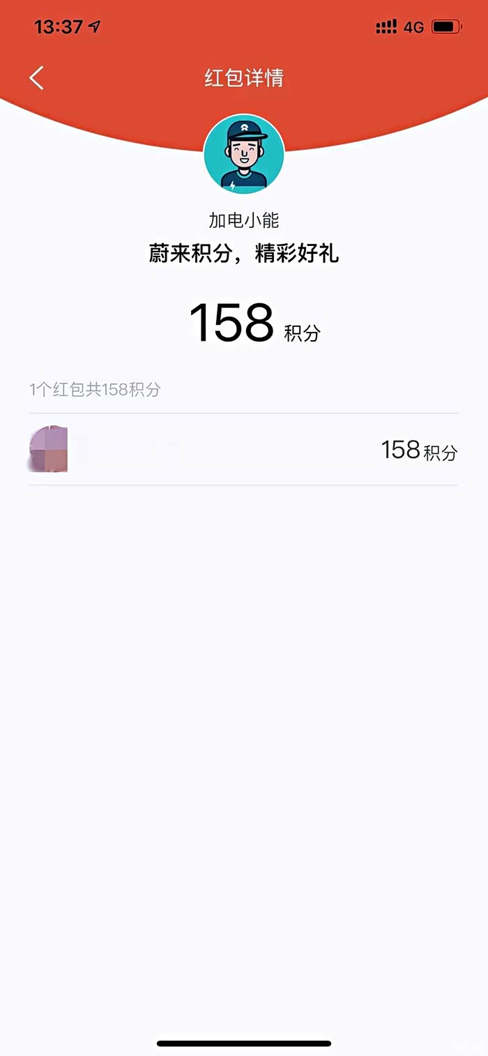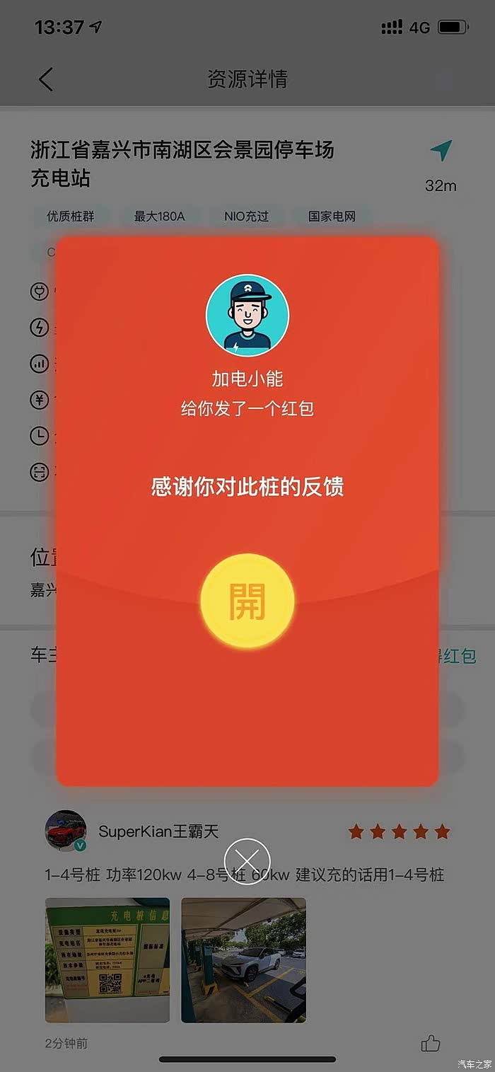 在一个小时的样子,小6顺利充满了。我也在蔚来app里对该充电桩的真实情况进行了反馈。想不到加点小能就马上给我发了一个红包