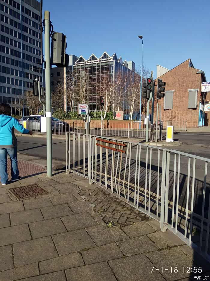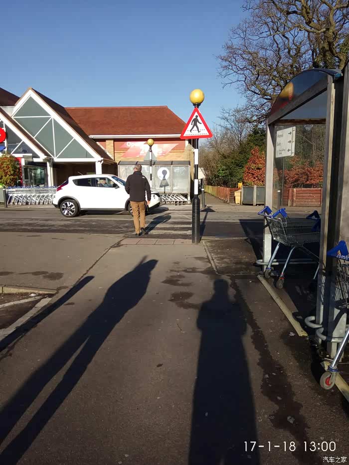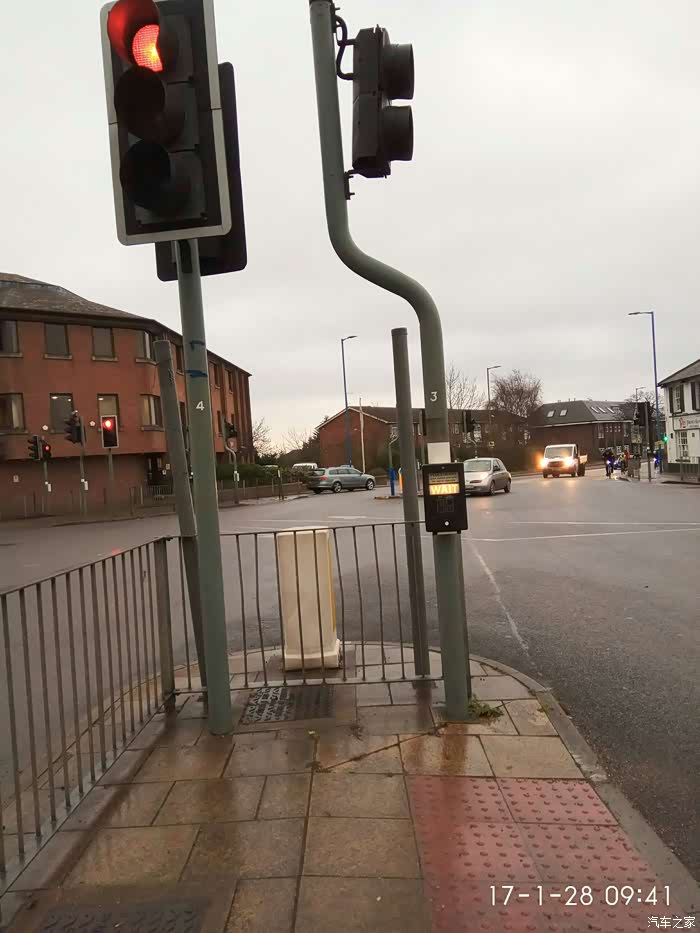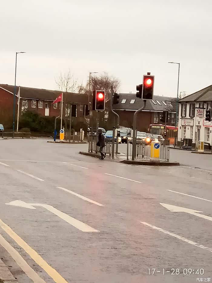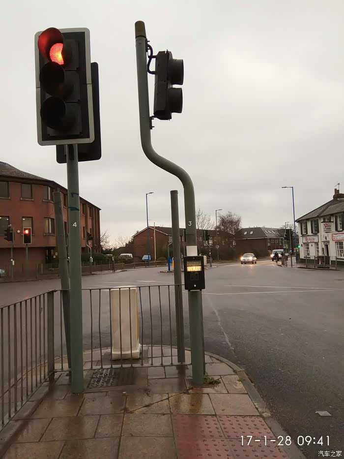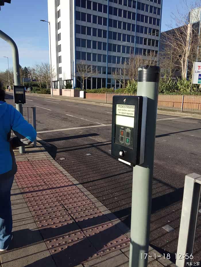 这是第二种横过马路的方式: 英国是靠左侧行走,过这种路口行人要等红绿灯,谁是绿灯谁就有路权。