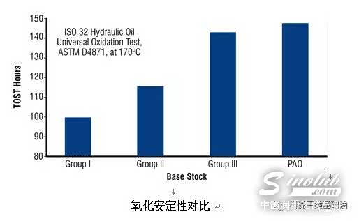 图中的实验结果来自于通用氧化实验Universal Oxidation Test (ASTM D4871),对比了当油的酸值(酸值能体现润滑油的氧化程度)达到2.0时,润滑油的使用小时数。时间越短说明油变质越快。