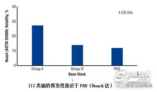 使用Noack法测试挥发率,试验方法ASTM D5800,实验结果现实,III类油的挥发度和PAO接近,PAO比III类油挥发率略低,III类油则甩开II类油一大截。