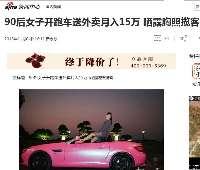 比媳妇当车模还震撼:女子晒露胸照揽客 开跑车送外卖月入15万!