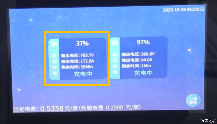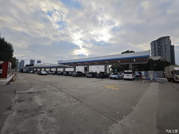 提车后的几天时间里,我基本都在车库和公司用慢充充电,勉强可以保证每天的通勤使用。后来搜到家附近的快充桩凌晨00:00-08:00谷段时间充电很便宜(0.54元/度)之后,我就想去体验一下,去把门摸清,方便以后的使用!于是乎,10月26号这天我早早起床,6:30左右把车开到了充电站,那两排快充站整齐的排列在这里,很多位置都被滴滴和出租车占着充电了,还剩下零星的7-8个车位,好家伙,利用率还挺高的哦。好在空着的车位的充电设备也都是完好的,我就直接找了一个位置停了进去,把枪插枪扫码预付款充电一气呵成!