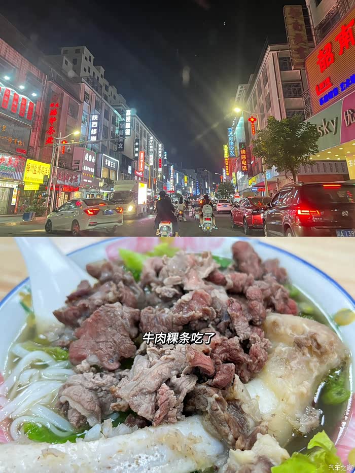 到达惠州又是深夜了,住的地方附近灯火通明,和没有夜生活的江苏不同的是,街边有很多小吃,奶茶店也没有关门,半夜竟然还能买到奶茶。旁边就是充电站,把车丢到这里充电,然后去逛吃一下,街边都是本地特色美食,首先牛肉粿条安排上,广东的牛肉超级鲜,一碗汤不够又加了一碗,真的很好吃。胃暖了身体似乎都没那么疲劳了,一顿夜宵给这两天的劳累一个大大的安慰。