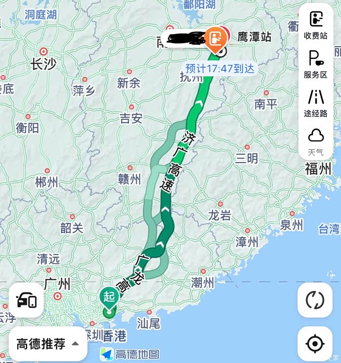 出发之前,实时规划路线。早上起来没有着急出发,因为是放假第一天,看了看导航选择一个相对不太堵的时间段出发更好。早上六点的时候很堵,看来大聪明不止我一个,于是在慢慢收拾行李的过程中等到了中午,此时就没有那么堵了,那么就出发吧。关于这段旅程的路线呢,南京出发,途径安徽、江西境内,最终穿越省界来到广东省,目的地惠州。考虑到001的新能源属性,途中不必太着急,既然要充电就到途径的城市走一走,感受下当地特色,不必赶路过于劳累。