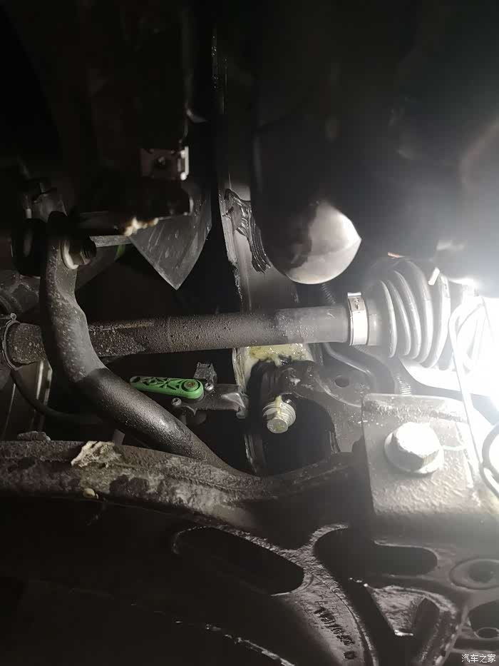 在卸下发动机护板的时候,感觉护板有油,心想这下算是中奖了,不会像论坛里的那位技术大神所说的530油底壳漏油吧? 但仔细看后,发现原来是前支臂紧固地方涂抹的固体油高温熔了一些,心里一下踏实。