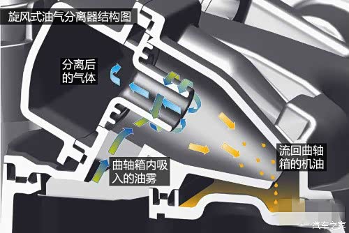 机油不是在发动机润滑系统内吗?理论上应该是隔离的才对啊,其实并非如此。汽缸内活塞的上下剧烈运动,会不断改变曲轴箱内气压,而活塞环的密封也是相对的,根本就是有不少的废气会窜入曲轴箱的。这样一来曲轴箱的压力就复杂了,一开始的设计是让曲轴箱直通大气,窜入的废气也一同排出,后来环保法规日趋严格,直排大气被禁止,而且废气中其实也还有不少没有完全燃烧的气体,所以现在我们看到的都是封闭的曲轴箱通风系统。