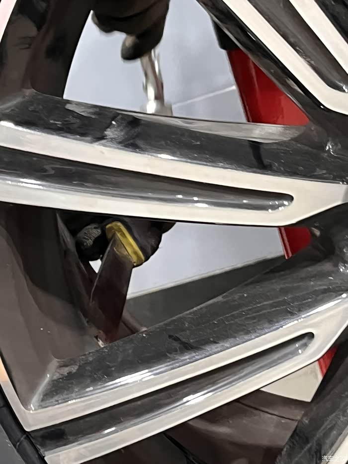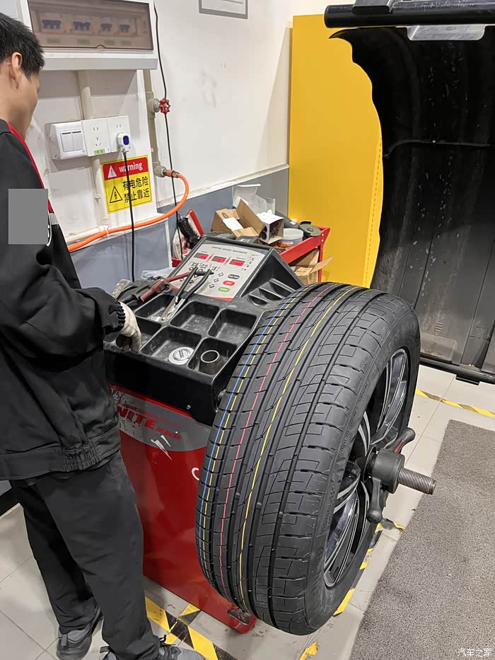 接着为新轮胎做动平衡。将轮胎挂在一台机器上,启动后轮胎开始高速旋转,机器上的液晶数字不停变化,师傅操作了一番后,在轮毂内侧的两三个位置分别贴上了配重金属片。师傅说动平衡能确保轮胎在行驶过程中不会产生异常震动。