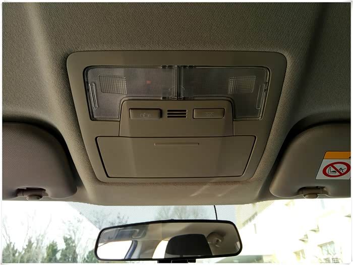后视镜、顶灯、眼镜盒,遮阳板下有化妆镜,可是没灯