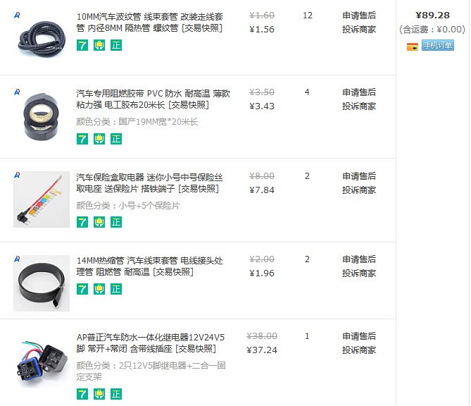 购买防火胶布、波纹管、ACC取电器、防水继电器等材料,89.28元