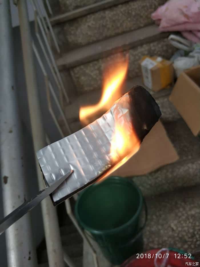 10月7号对保温棉做的燃烧试验,火机可以点燃(特别是背胶),离火自动熄灭,据店小二说保温棉里面有阻燃剂。