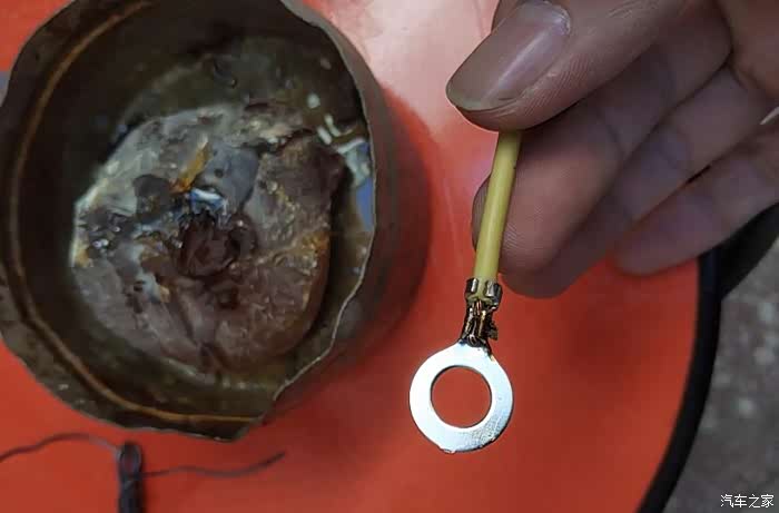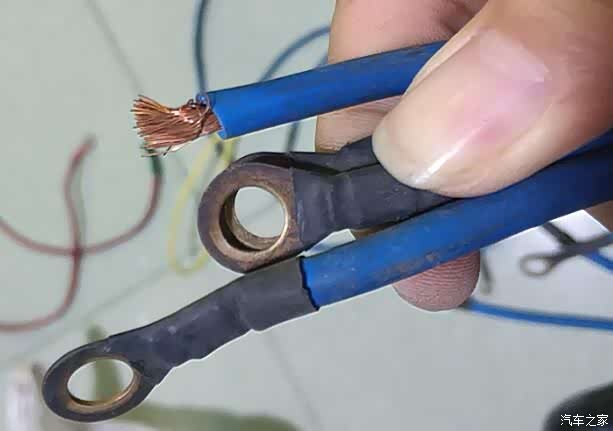 家里找了原来电瓶的连接线,应该是4平方的,做8路保险盒的火线,红线的铜鼻子破了,只有蓝色线材,已经严重氧化,刀片除锈、上锡防锈(朋友帮忙)